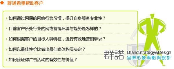 通过与我们合作(选择我们的服务之后),您可以和群诺广告公司行业领域的资深分析师建立起伙伴关